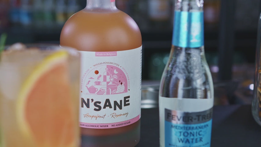 Alcohol-free drink with subtle flavors of grapefruit and rosemary, without added sugars, preservatives, or artificial colors, flavors, or fragrances for a refreshing experience.